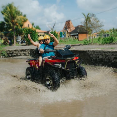 Ride ATVs thru a rice field, a river and, a cave